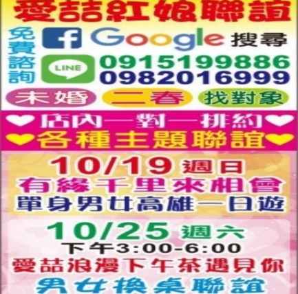 没参加到的人下次下梯③活動聯誼 請速向翁姐報名速來電~向翁姐報名訂位(名額有限) ①❤️活動: 愛喆遇見妳~ 單身浪漫下午茶男女換桌聯誼 10/25周六下午2:45報到 下午3:00至6:00舉行 A未婚組 B晚未婚二春組~ ②❤️活動: 11/2周日單身男女旗津1日旅遊趴趴go ③❤️活動: 12/21周日下午茶單身男女聖誕趴 男女穿红色或白色或綠色或穿搭造型換桌聯誼 下午3-6點 A未婚組 B晚未婚二春組 再回翁姐 注意! 再回翁姐 ❤️速來電0915199886或0982016999向翁姐報名 ►愛喆活動聯誼報名表連結